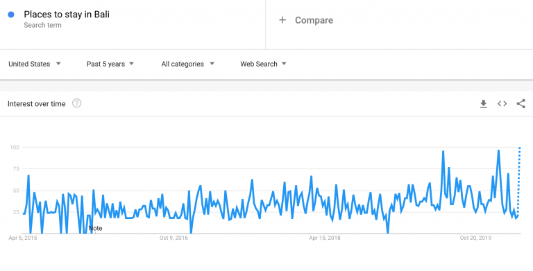 If you can find evergreen topics that not only have on-going, but also growing search interest, then even better! For example, take a look at this “Places to stay in Bali” chart below: