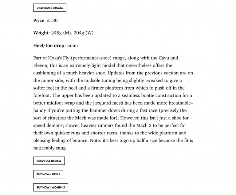 The price, weight and heel/toe drop are clearly listed, and they have several buttons (that look really natural) with links to more images and also to the full in-depth review page for each shoe. They also have ‘Buy Now’ buttons for both men and women, for which they use Skimlinks to automatically generate affiliate links.