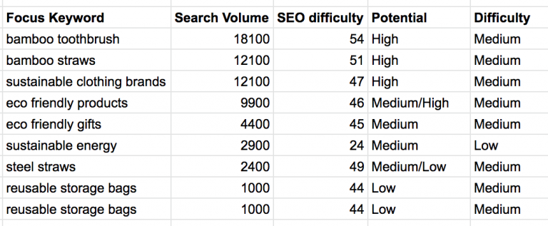 To give an example of how your research could look like, let’s take the example of a blog on sustainability. In the table below you can see a list of keywords relevant to sustainable living that would be great for commerce content: