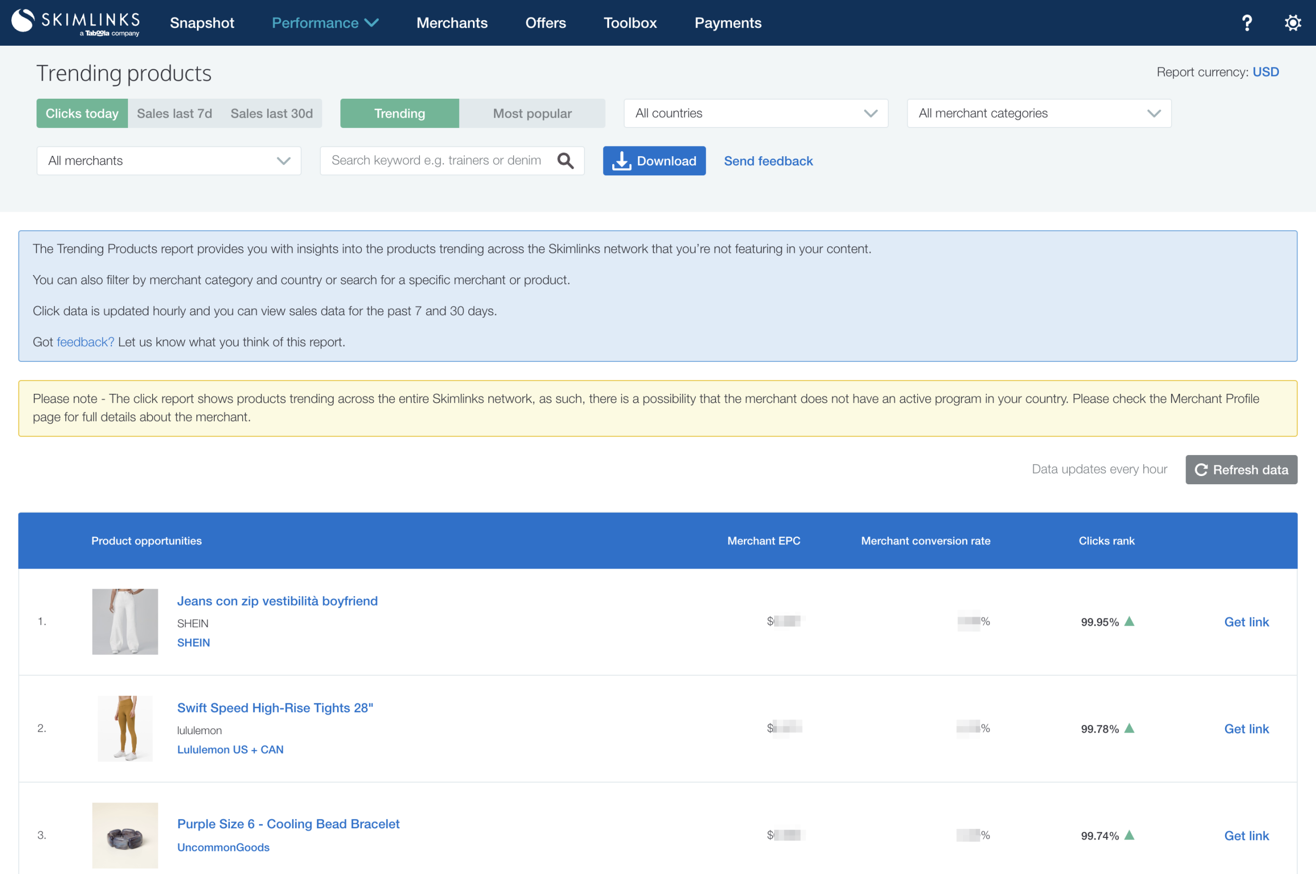 - Trending Products – see which products that you’ve not featured are trending across the Skimlinks network to help you create reactive, relevant content.