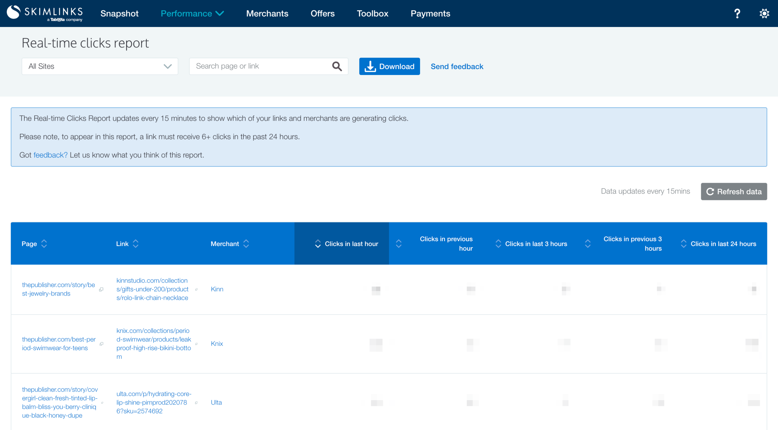 Use the Real-time Clicks Report to see which of your links, pages, and featured merchants are driving the most clicks right now. Spot your high-performing content, check that the products featured are still in stock and relevant, and then maximize your reach by sharing it out on social media or featuring it on your homepage.